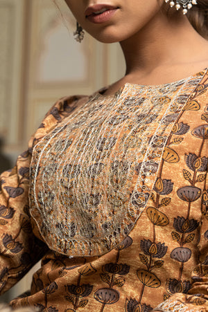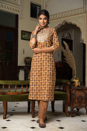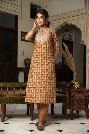 Beige Hand Block Printed Cotton Kurta with Pants- Set of 2