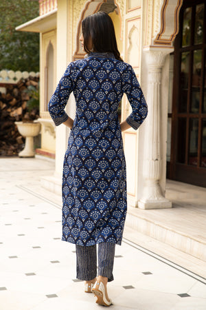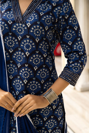Blue Dabu Hand Block Printed Cotton Suit with Chiffon Dupatta- Set of 3