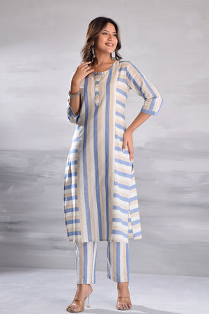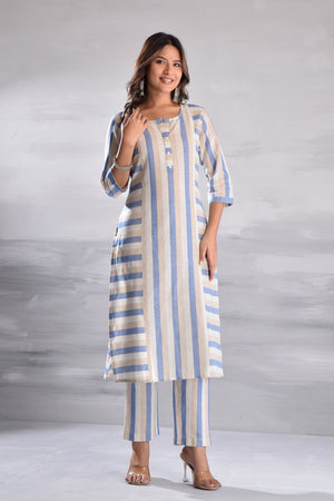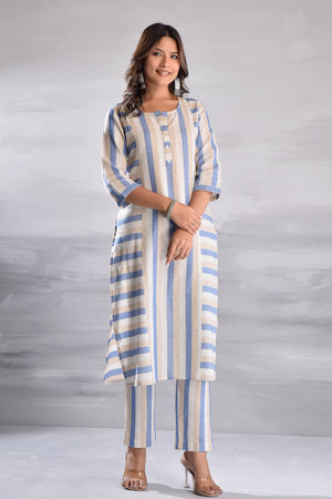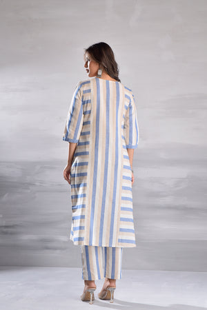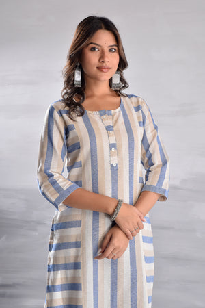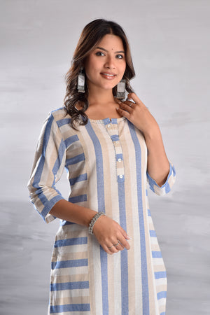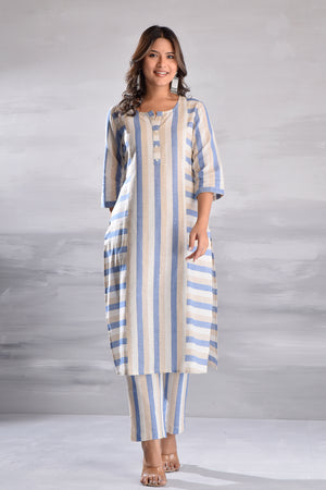 Blue Eco-Chic Cotton Kurta Set with Wooden Buttons & Kantha Tagai Work