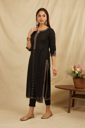 This two-piece set includes a kurta with pants. The cotton kurta comes with hand block prints, hand work on front, a round neckline and 3/4th sleeves with slit on cuffs. The cotton pants have an elasticated back.