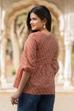 This peach printed top is made of best quality comfortable cotton fabric with v neck, having gather at all around bottom gives this top a cassic look. Embellished with single button on its 3/4th sleeves.