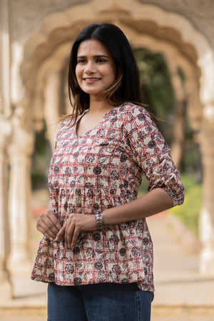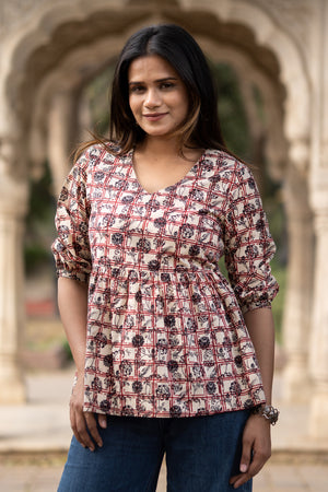 This multi coloured printed top is made of best quality comfortable cotton fabric with v neck, having gather at all around bottom gives this top a cassic look. Embellished with single button on its 3/4th sleeves.