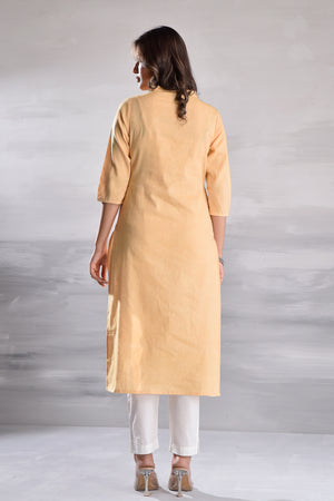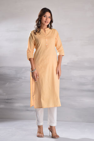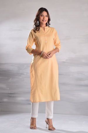 This minimalist cotton kurta set features a classic collar neckline with button detailing, paired with a matching bottom.