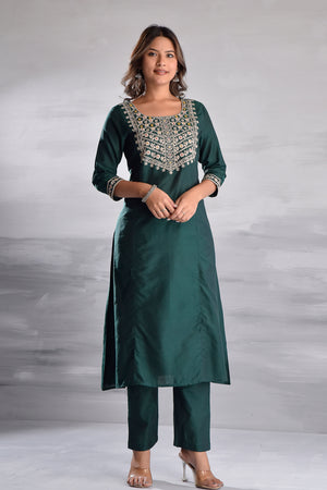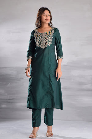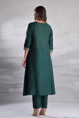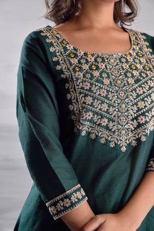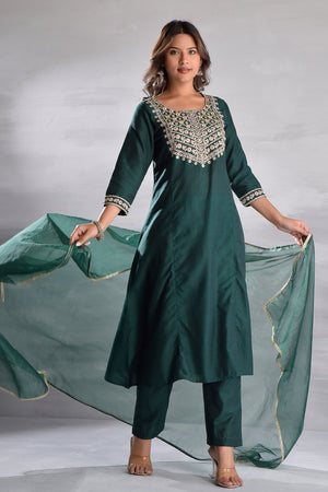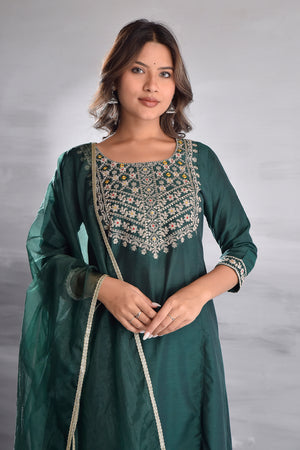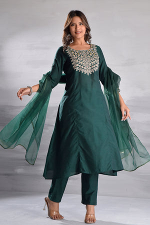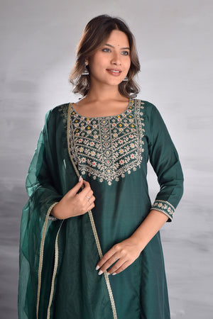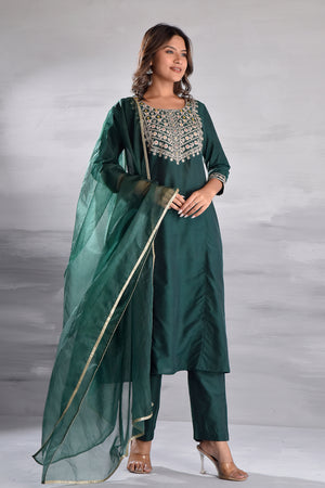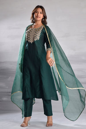 Dark Green Elegant Embroidered Silk Slub Kurta Set with Organza Dupatta