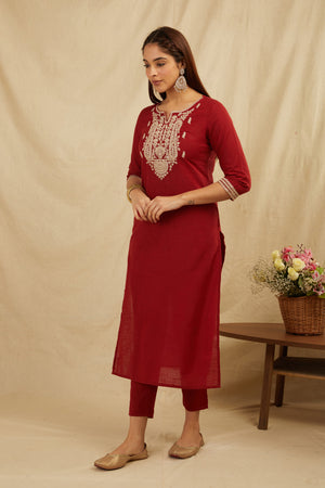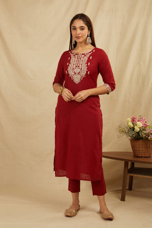 Maroon Cotton Partywear Suit Set -2 With Work On Yoke