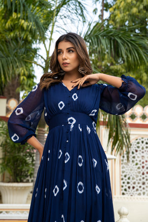 This chiffon tie dye printed navy blue colored long dress is perfect for any formal or semi-formal occasion, whether it's a summer wedding or a cocktail party. It can be easily dressed up with a pair of strappy heels and statement jewelry, or dressed down with sandals and a denim jacket for a more casual look.