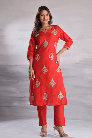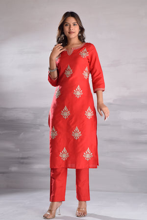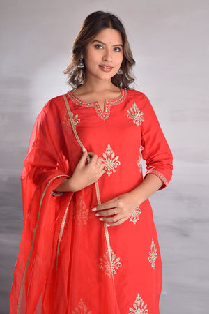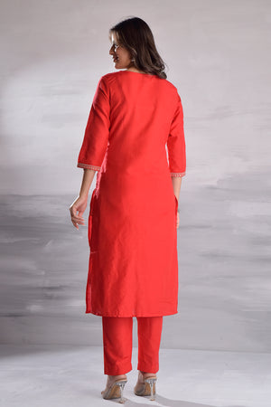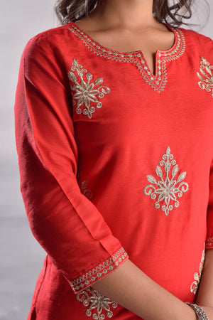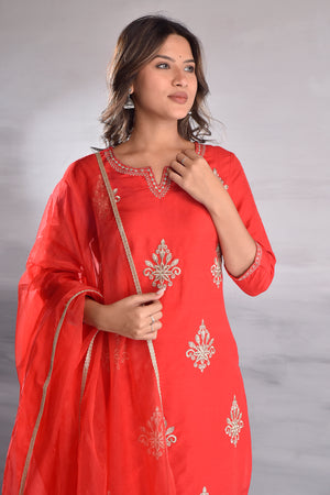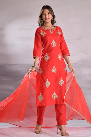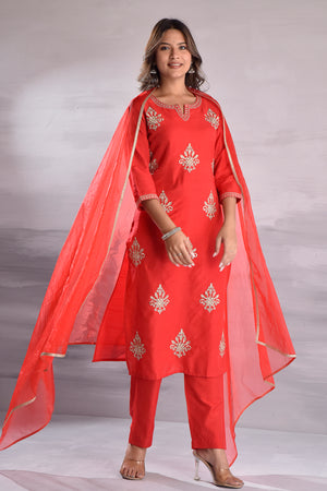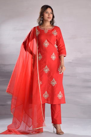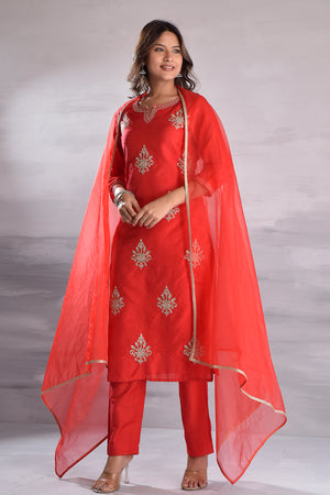 Red Elegant Embroidered Silk Slub Kurta Set with Organza Dupatta