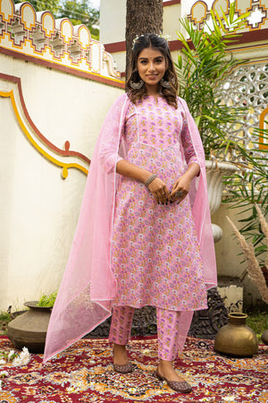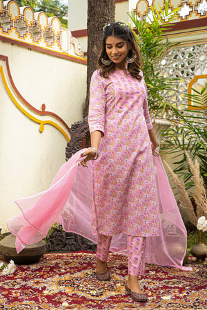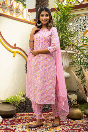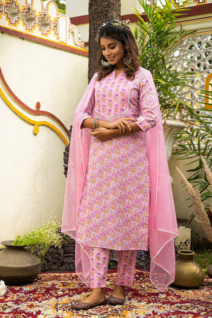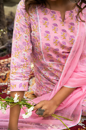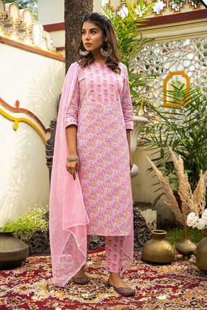Pink Printed Cotton Suit with Kota Doria Dupatta- Set of 3