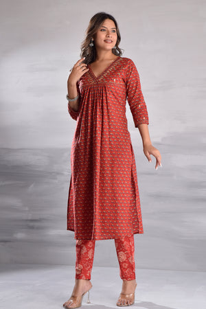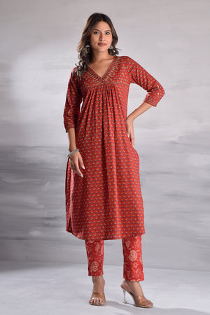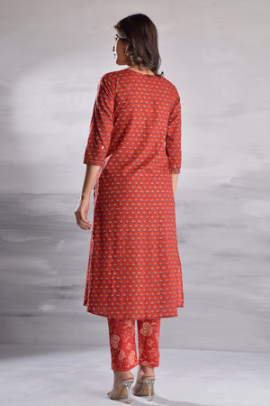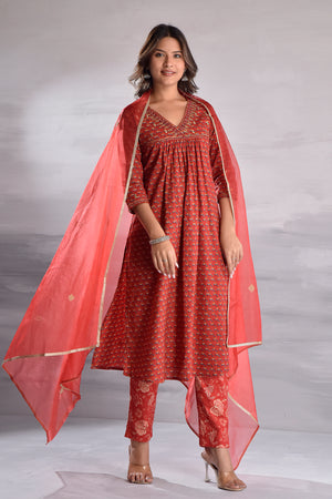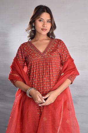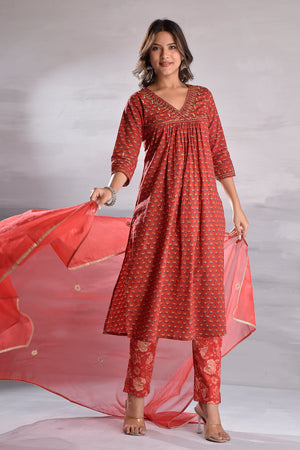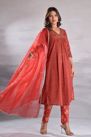 Red Printed With Handwork Cotton Kurta Set with Organza Dupatta