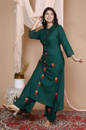 Sea Green Rayon Embroideried Solid Long Kurta with Palazzo- Set of 2