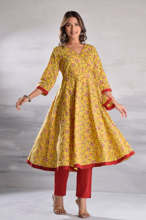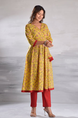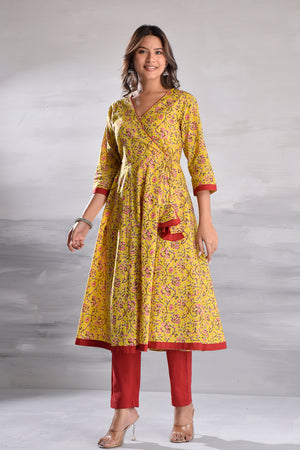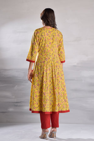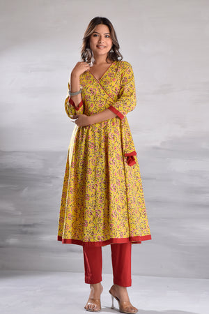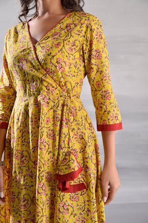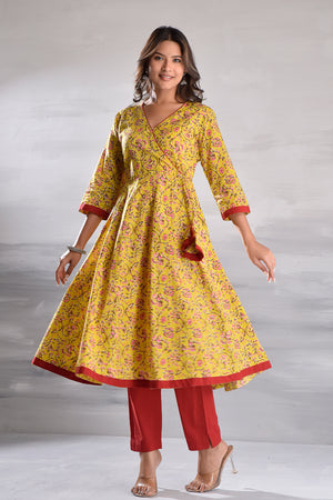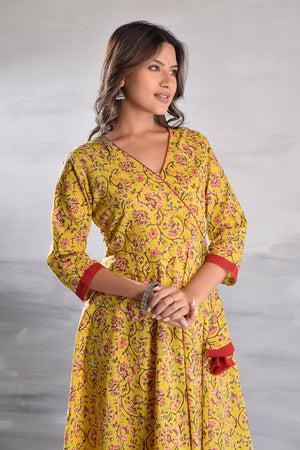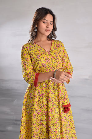 Yellow Jaal Printed Angrakha Pattern Cotton Kurta with Tassel Detailing