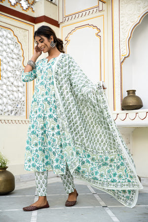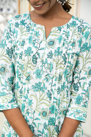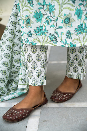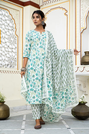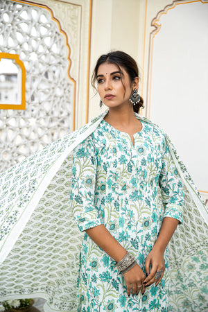 White Cotton Block Printed Kurta Pant Set With Pleats & Printed Cotton Dupatta