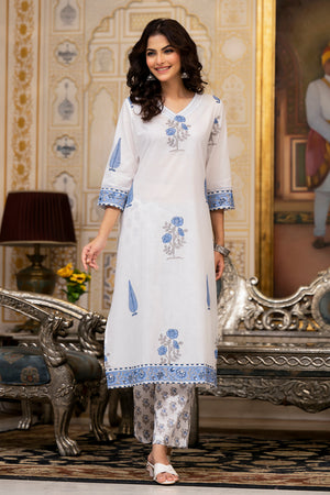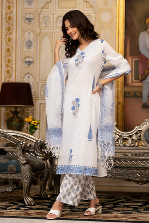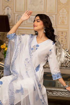 White Cotton Mughal Block Printed Kurta Pant Set With Dupatta