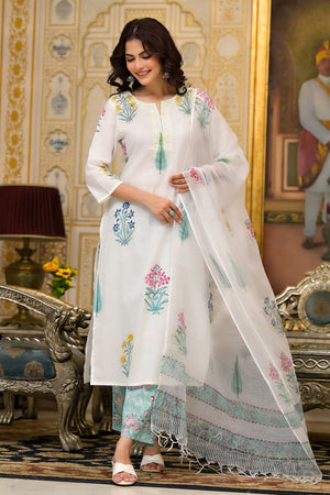 White Cotton Mughal Block Printed Kurta Pant Set With Dupatta
