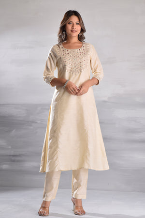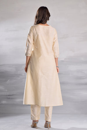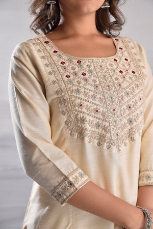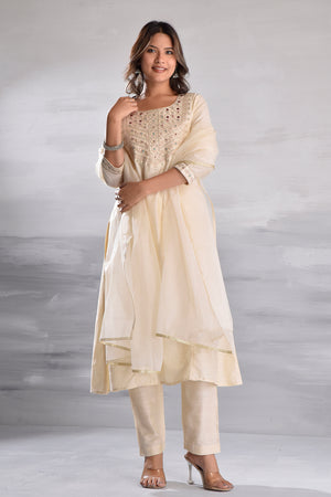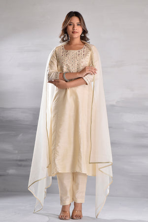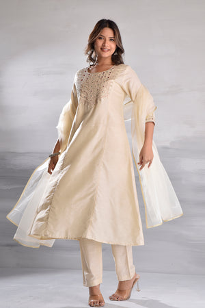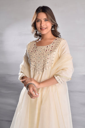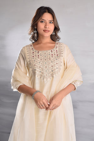 White Elegant Embroidered Silk Slub Kurta Set with Organza Dupatta
