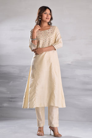 This luxurious silk slub kurta set features intricate embroidery, a matching bottom, and a delicate organza dupatta.