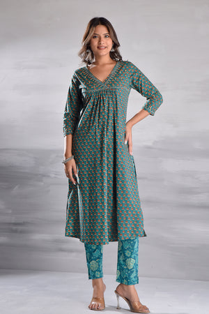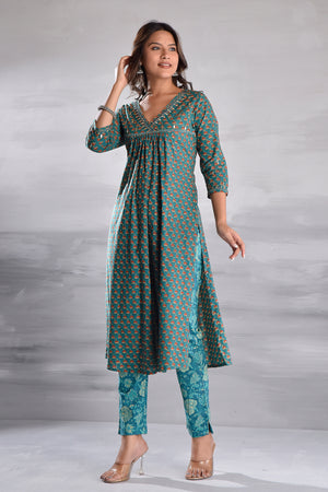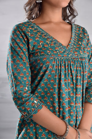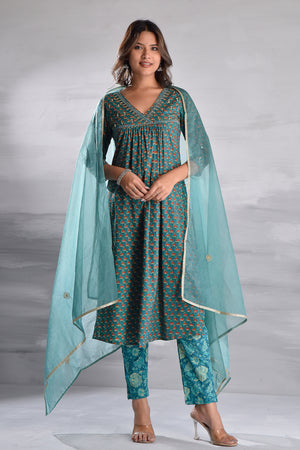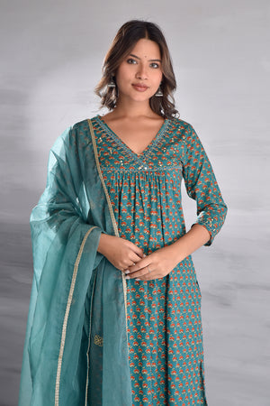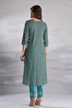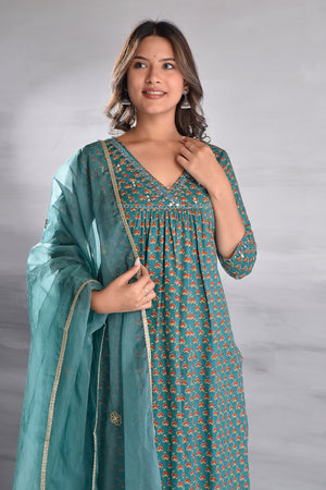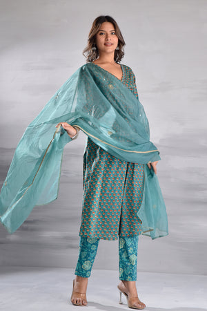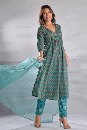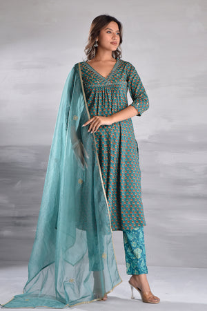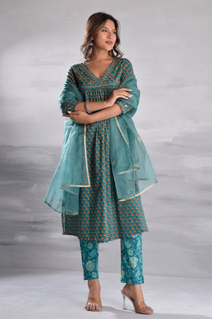 Green Printed With Handwork Cotton Kurta Set with Organza Dupatta