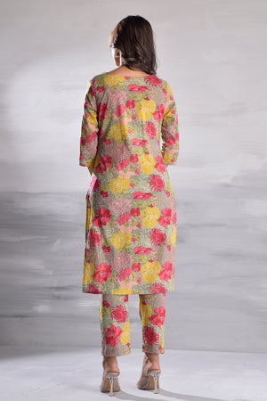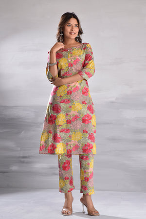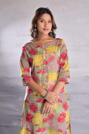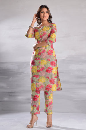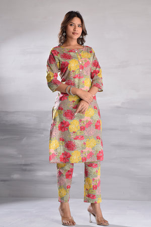 This stylish cotton co-ord set features a unique two-piece collar design with wooden buttons, offering a sustainable and elegant look. Lightweight and versatile, it’s perfect for a chic ethnic outfit.