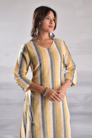 This minimalist cotton kurta set features a flattering V-neck design, paired with a matching bottom.