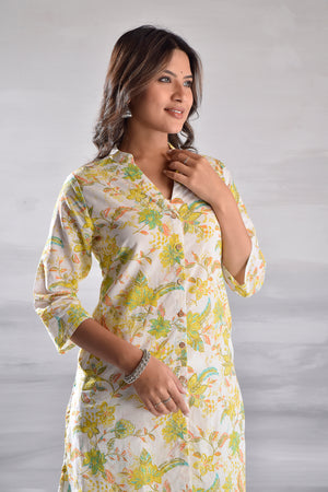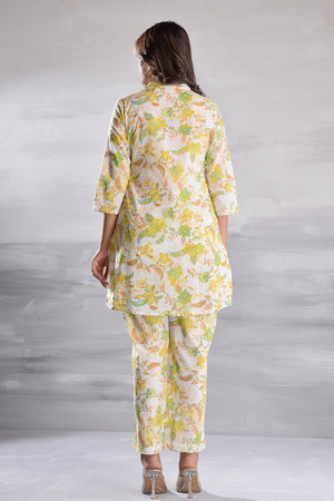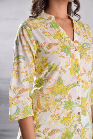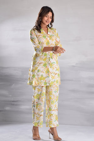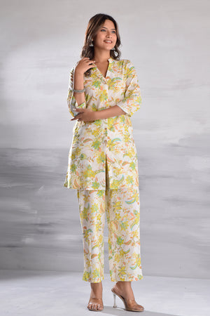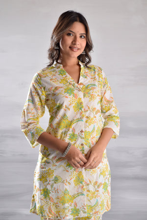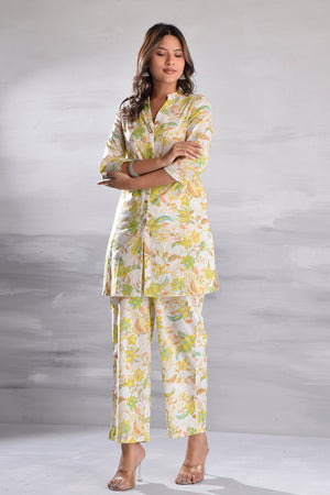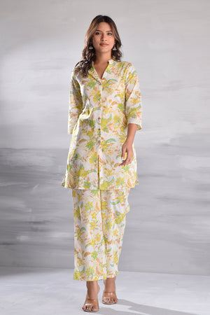 This stylish cotton co-ord set features a collar neckline with wooden buttons, offering a sustainable and elegant look.